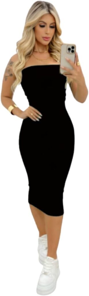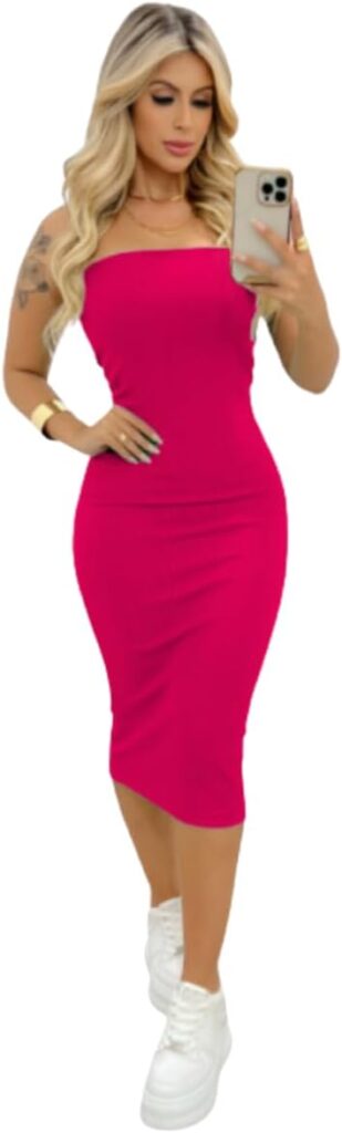 Vestido Feminino Tubinho Midi Anarruga Sem Alça: Modelo tubinho midi, sem alça, tecido anarruga (amassado leve) – visual mais justo e elegante, para público que prefere algo mais ajustado.