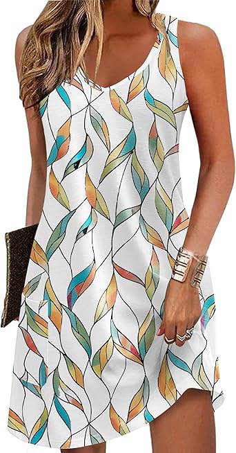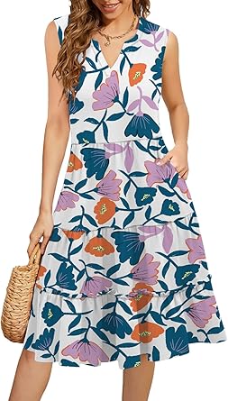 Vestido De Verão Elegante Sem Mangas Boho Midi: Versão mais “elegante midi”, ainda confortável, sem mangas — ótima para eventos leves durante o verão. vestido de sol macio, leve, rodado; vestidos de linha com babados franzidos em camadas e fofos, bolsos, sem mangas, comprimento acima do joelho, podem ser casuais ou formais para visuais versáteis; Bom para ser essencial para férias de primavera e verão na praia