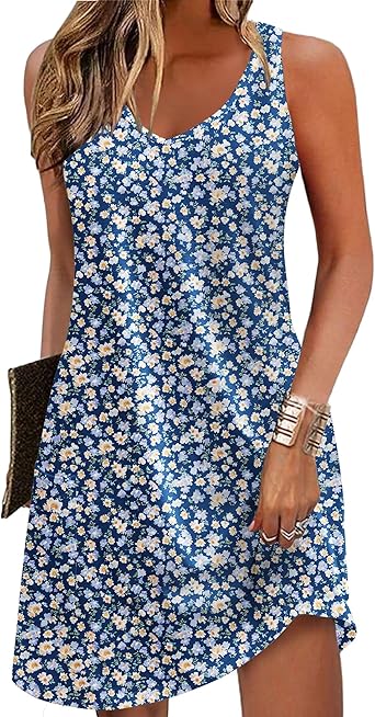 Vestidos de verão para mulheres praia boho sem mangas vintage floral solto bolso camiseta vestidos de verão